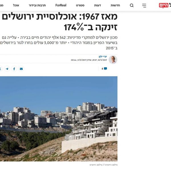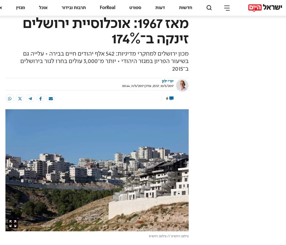 | 2017 | עיתונות | ישראל היום | מאז 1967: אוכלוסיית ירושלים זינקה ב־174% | ארצי |