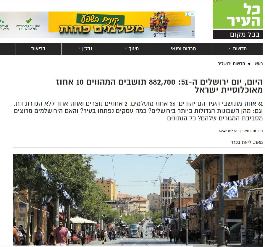| 2018 | עיתונות | ישראל היום | מאוחדת וגדולה: כמעט 900 אלף ירושלמים | ארצי |