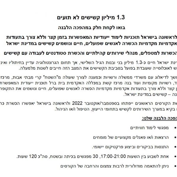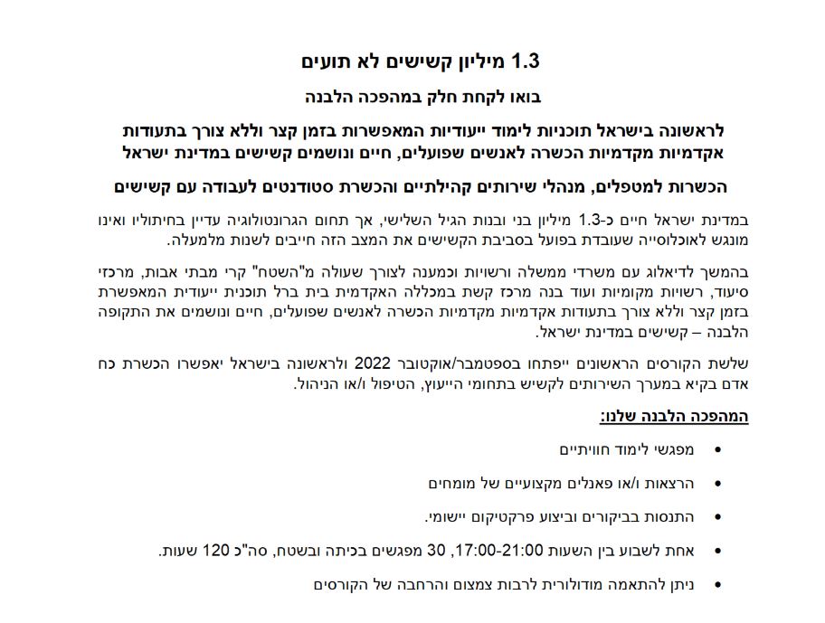 יצירת מסלולי הכשרה חדשים שחסרים בשוק התעסוקה (גרנטולוגיה ועוד). הבניית שיתופי פעולה מחוללי צמיחה.